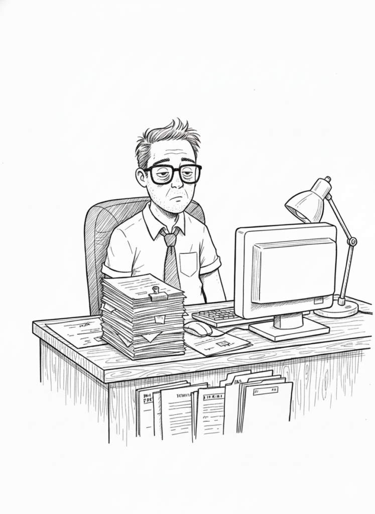 When it was finally my turn, I approached the counter where a tired-looking man with glasses sat behind a stack of papers that made the skyscraper guy’s pile look tiny.